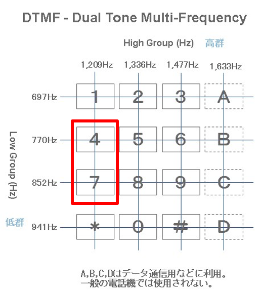 - DTMFは「2つの周波数の組み合わせ」で数字や記号を伝える電話用の信号方式。