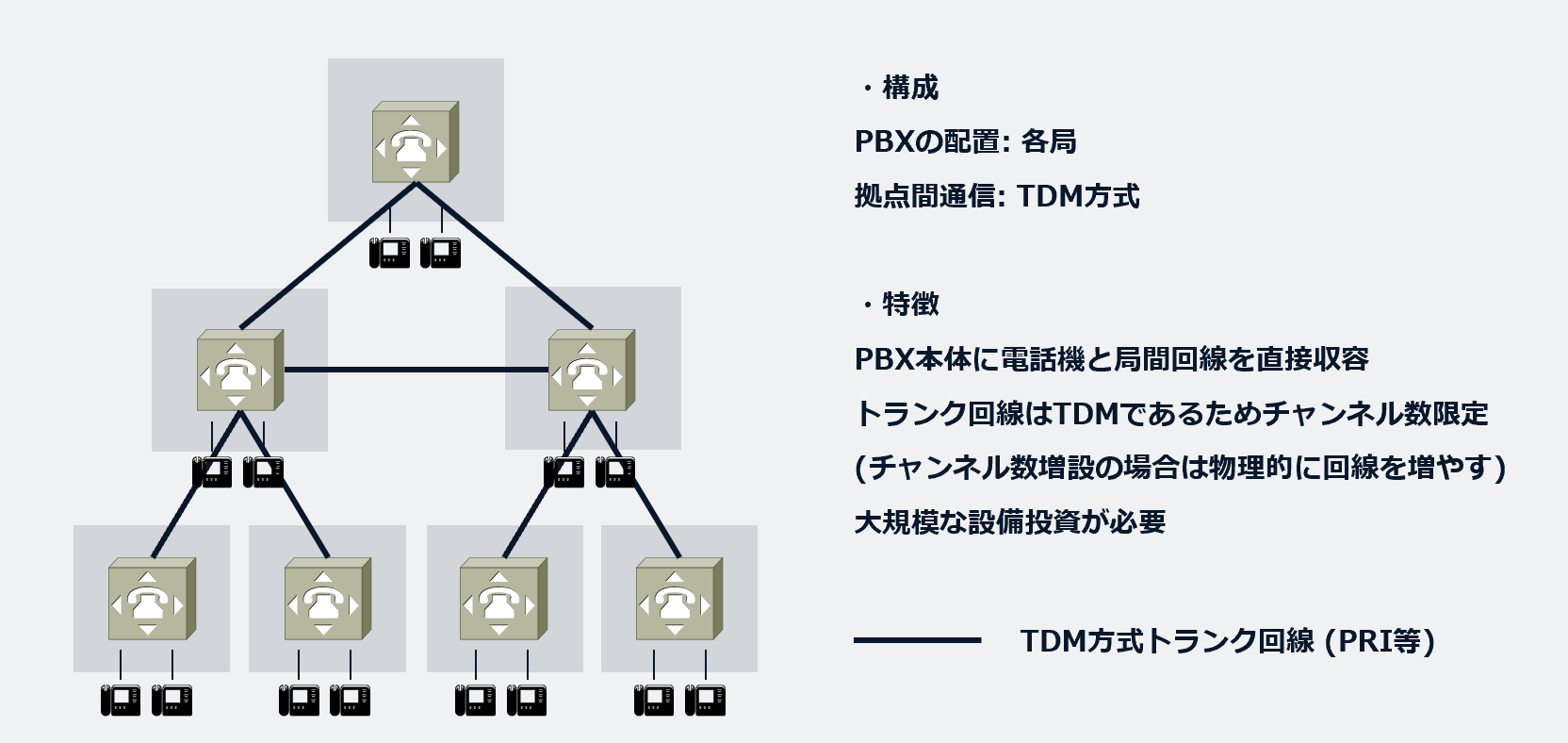- TDMによるトランク接続: 拠点間の通信や公衆電話網(PSTN)との接続には、TDM(Time Division Multiplexing:時分割多重)方式のトランク回線が用いられました。TDM PBXは物理的なスイッチを使用してコールをルーティングし、専用の回線を必要としました。