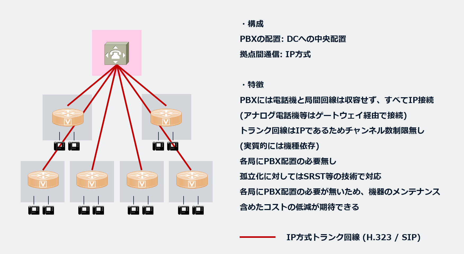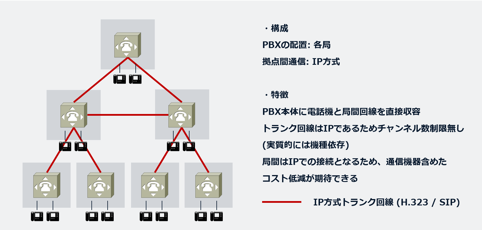 - TDMトランクのIP化: 従来のTDMによるトランク接続は、H.323やSIP(Session Initiation Protocol)といったプロトコルを用いたIPトランクへと移行しました。これにより、音声データがインターネットプロトコル(IP)ネットワークを介して送受信されるようになります。