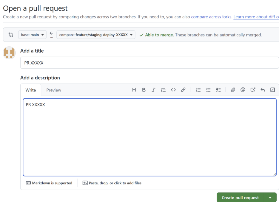 「Open a pull request」画面で「Add a title」と「Add a description」を入力 (例: PR YYYYMMDD-1)後「Create pull request」を押す