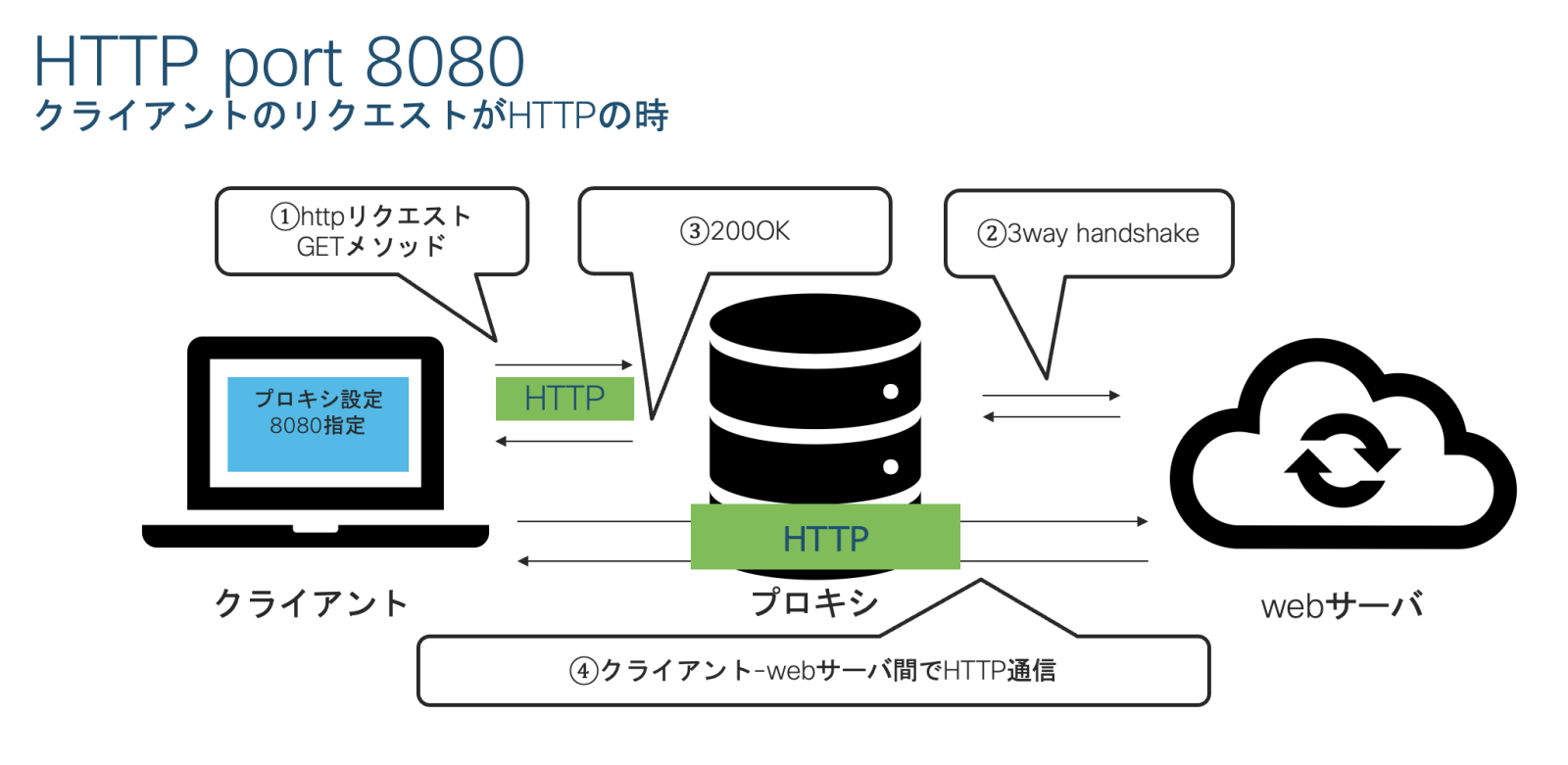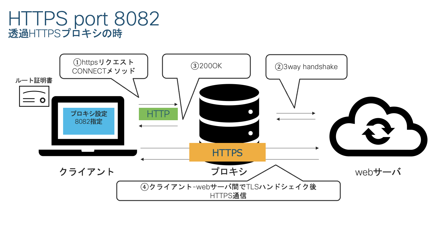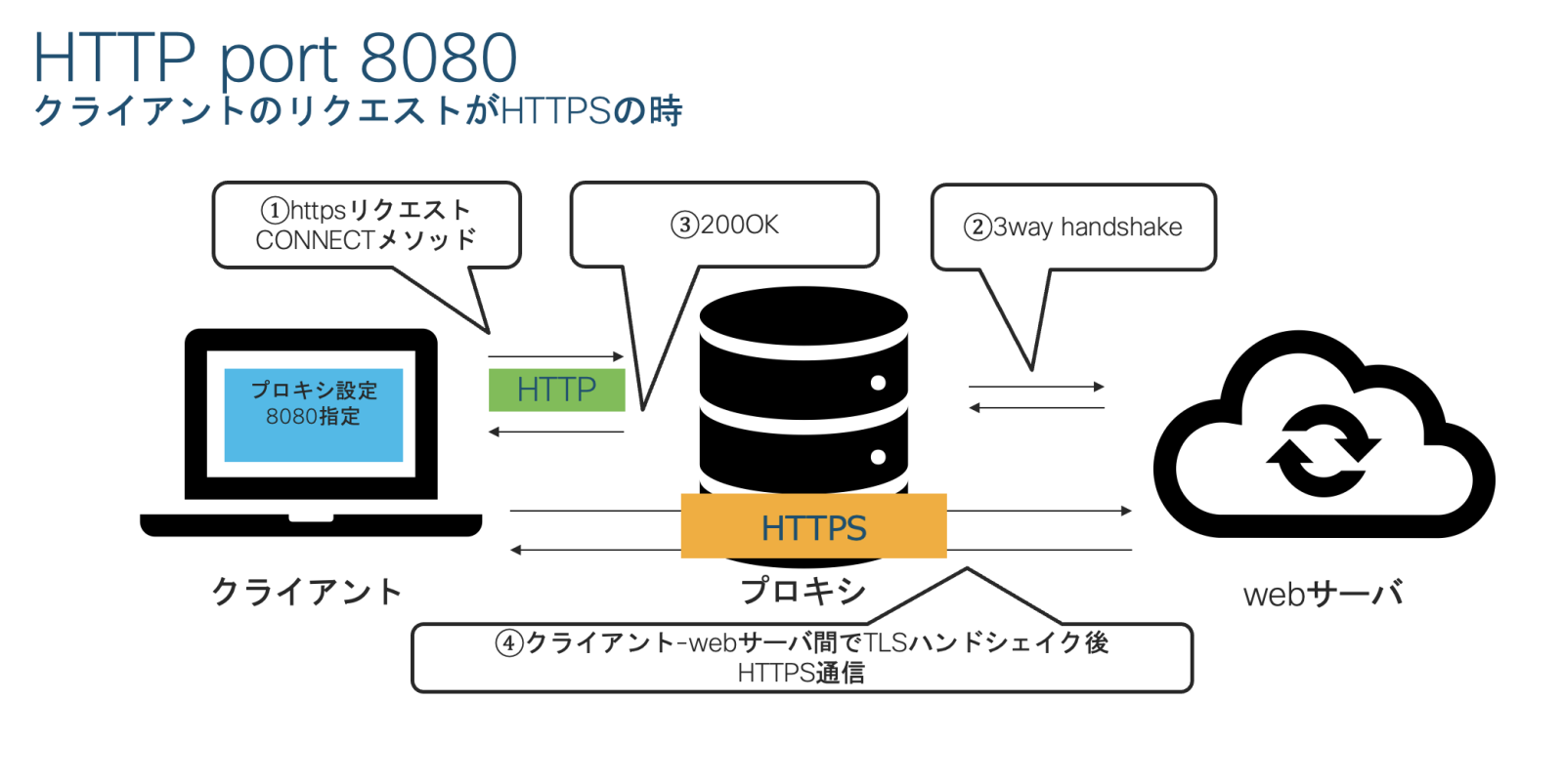 # HTTPSをCONNECTで通す(明示プロキシ8080)